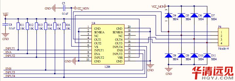 如圖二所示,在電路中P4接口接入兩路直流電機A和B,控制引腳INPUT1、INPUT2、ENA控制A組直流電機,INPUT3、INPUT4、ENB控制B組直流電機。以A組直流電機為例,INPUT1、INPUT2引腳控制電機的轉動方向,使能管腳ENA控制電機轉動與否,該管腳可接入PWM調制波形,可以實現對直流電機的功率控制,從而間接的控制了電機的轉速。B組電機控制方式與A組完全相同。