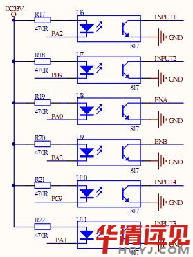 本例程使用的控制芯片為STM32F1系列,其控制電壓為DC33V,因此有圖三電路。使用光耦開關將L298N控制電路與控制芯片的控制電路進行了光電隔離。