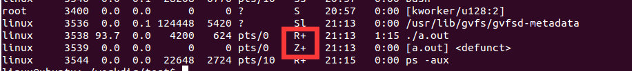 此時父進程3538狀態(tài)為R+而子進程狀態(tài)為Z+,通過查看ps命令文檔可的如下說明: