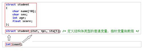struct student stu1, *ps, stu[5]; /* 定義結構體類型的普通變量、指針變量和數組 */