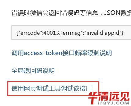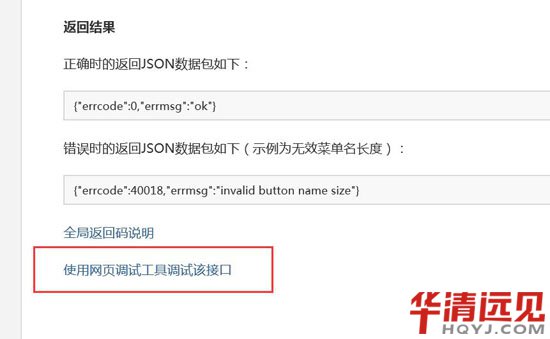 按照需求根據(jù)示例做好菜單后,在文檔下面可以發(fā)現(xiàn):使用網(wǎng)頁調(diào)試工具調(diào)試該接口。