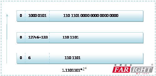 那么如果給出內存中一段數據,并且告訴你是單精度存儲的話,你如何知道該數據的十進制數值呢?其實就是對上面的反推過程,比如給出如下內存數據:0100001011101101000000000000,首先我們現將該數據分段,0 10000 0101 110 1101 0000 0000 0000 0000,在內存中的存儲就為下圖所示: