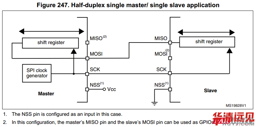 看見了沒!現在知道為毛是三線了吧?上面已經表示出了主機和從機之間的接口連接方式,有時候只需要一直講NSS處于一個低電平狀態,就可以一直正常通信了。至于發送數據那就是CLK,NISO,MOSI的事了。