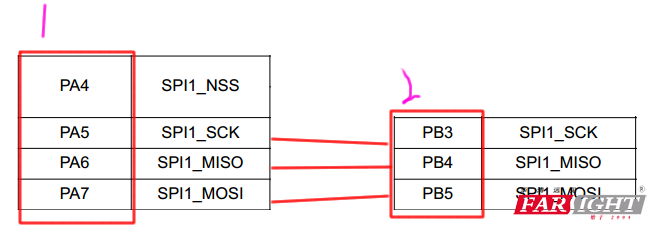 注意紅線框出的部分,這就是我們這款單片機擁有的SPI外設資源和支持的功能資源。非常重要!!!