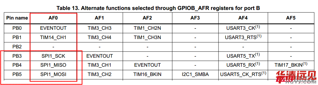 問題就來了!你咋知道我們所用的資源對應的到時是哪一個GPIO_AF_x?比日說SPI1從函數說明來說可能是GPIO_AF_0也可能是GPIO_AF_1,這個咋玩呢??還是一句話,在參考手冊或者數據手冊Datasheet上找,肯定能找到。沒錯,就是在Datasheet上找到了!如下圖: