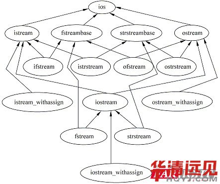 由圖可以看到:由抽象基類ios直接派生出4個派生類,即istream,ostream,fstreambase和strstreambase。其中fstreambase是文件流類基類,由它再派生出ifstream,ofstream和fstream。strstreambase是字符串流類基類,由它再派生出lstrstream,ostrsCeam和swsWeam類。