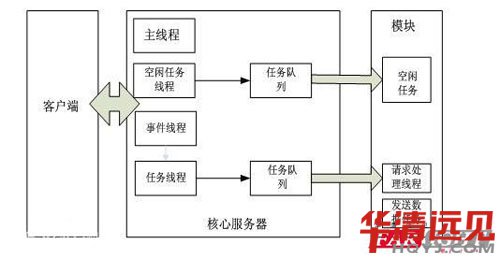 任務線程。任務線程會把事件從事件線程中取出,并把處理請求傳遞到對應的服務器模塊進行處理,比如把數據包發送給客戶端的模塊,在默認情況下,核心服務器會為每個處理器核創建一個任務線程。