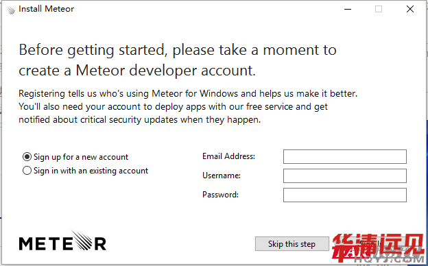 如果在安裝過程中發(fā)生任何錯(cuò)誤,可以嘗試以管理員身份運(yùn)行安裝程序。當(dāng)安裝完成后,它會(huì)要求你創(chuàng)建 Meteor 帳戶。