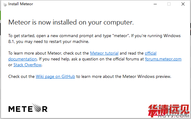 可以從meteor官網(wǎng)下載官方Meteor安裝程序, 下載過程可能有點(diǎn)慢。