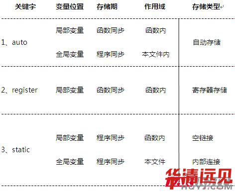 對于變量的存儲類型,前面遇到過一些疑惑,再簡單的在這里說一下。存儲類型是指存儲變量值的內存類型,它用來決定存儲空間的大小。變量的存儲類型決定著變量的存儲器和作用域。有三個地方可以用于存儲變量:普通內存、運行時堆棧、硬件寄存器。在這三個地方存儲的變量具有不同的特性。