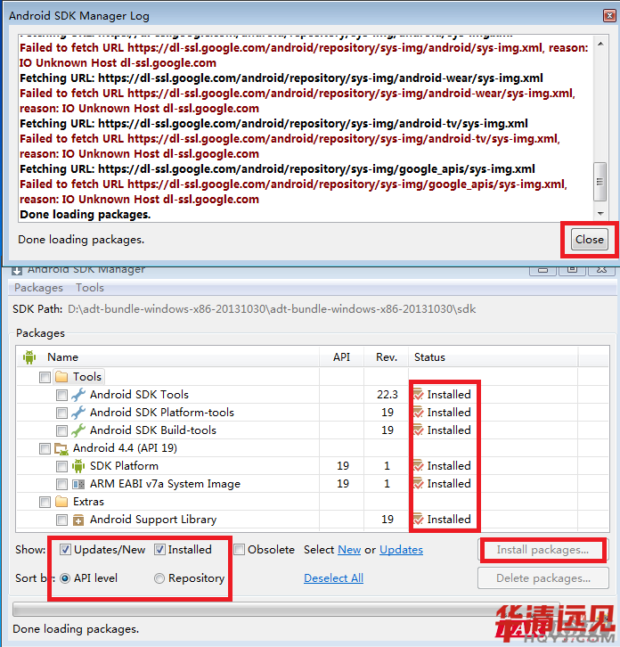 添加完成后,找到Adt-bundle-windows-x86-20131030\SDK Manager.exe運行。打開后,它會自動檢查更新,時間稍微長點。如果顯示有可以安裝的軟件包,點擊Install packag,安裝完成即可,沒有可以安裝的包,直接關閉即可。