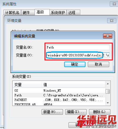 3、在環境變量Path中添加Adt-bundle-windows-x86-20131030\sdk\tools,同樣的注意加英文的分號后,再添加自己需要加上入的路徑。