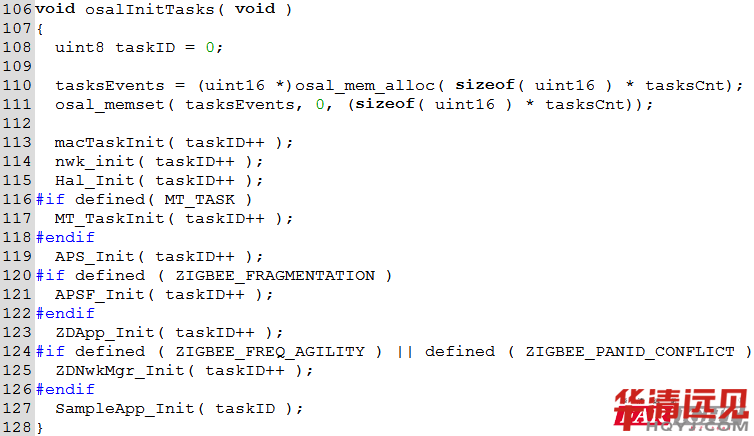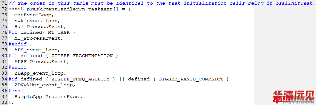打開OSAL_SampleApp.c文件,可以找到數(shù)組tasksArr[]和函數(shù)osalInitTasks()。tasksArr[]數(shù)組里存放了所有的事件處理函數(shù)的地址;osalInitTasks()是OSAL的任務(wù)初始化函數(shù),所有任務(wù)的初始化工作都在這里邊完成,并且自動(dòng)給每個(gè)任務(wù)分配一個(gè)ID。