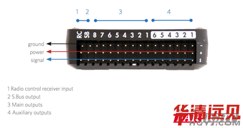 3. 主輸出,8 個(gè)PWM 通道,用于連接電調(diào)或者舵機(jī)。