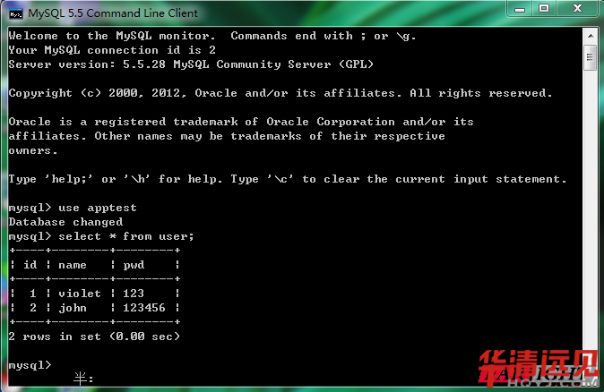 打開MySQL5.5 Command Line Client,輸入密碼(安裝MySQL時設置的密碼),進入到mysql中后,輸入use apptest;表示使用該數據庫。輸入select * from user;表示從user表中查詢所有數據,可以看到輸入如下圖所示: