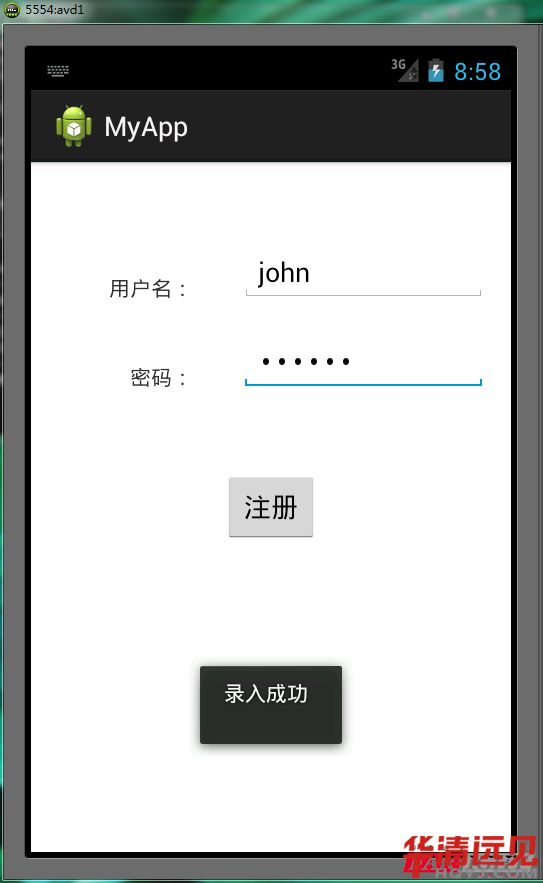 6) 啟動模擬器AVD,運行該項目。在輸入框中輸入用戶名john,密碼123456,點擊注冊,提示服務器返回結果,如下圖所示: