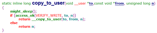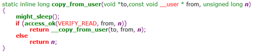 實(shí)際上Linux內(nèi)核中也提供了相應(yīng)的方法函數(shù),將用戶空間的數(shù)據(jù)拷貝到內(nèi)核空間進(jìn)行使用,其方法為:copy_from_user。原型如下: