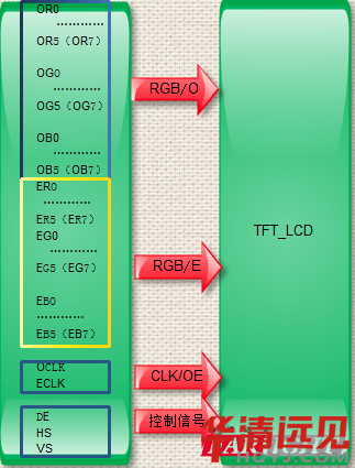 雙通道,也就是兩組RGB數據,分為奇通道、偶通道,時鐘有的也分為OCLK/ECLK,有的公用一個,我們示意圖上畫了兩個,如下所示: