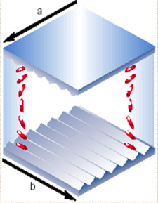 b、液晶的垂直分布:當(dāng)液晶被包含到兩個(gè)槽狀表面中間,且槽的方向互相垂直,則液晶分子的排列為,上表面分子沿著a方向;下表面分子沿著b方向;介于上下表面的分子產(chǎn)生旋轉(zhuǎn)效應(yīng),因此液晶分子在兩個(gè)表面間產(chǎn)生90度旋轉(zhuǎn)。