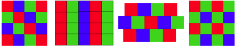b、彩色濾光片像素矩陣的排列方式如下,分別為馬賽克、直條式、三角形式、四化素
