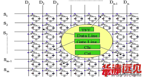 彩色單元對(duì)應(yīng)到TFT的控制單元,就可以完成我們像素點(diǎn)的顏色控制。TFT矩陣等效電路如下: