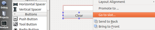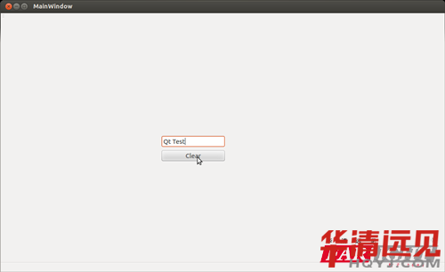 編輯UI界面,添加一個Line Edit和一個Push Button,并將Push Button的顯示的名稱改為Clear,將窗口的大小改為1024x600,這樣窗口可以布滿整個顯示屏。接下來為按鈕添加槽函數(shù),右擊按鈕,然后在彈出的菜單中選擇go to slot子菜單即可。