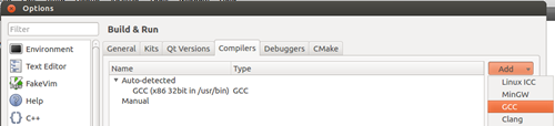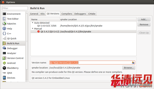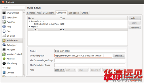 接下來選擇交叉編譯工具,在剛才的對話框中選擇Compilers選項卡,然后點擊Add按鈕。