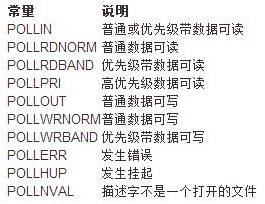 應為每個數組元素的events成員設置為下圖中值的一個或幾個,通過這些值告訴內核我們關心的是每個描述符的哪些事件。返回時,revents成員由內核設置,用于說明每個描述符發生了哪些事件。注意,poll沒有更改events成員,這與select不同。