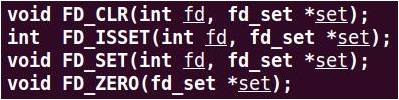 對于fd_set數據類型,唯一可以進行的處理是:分配一個這種類型的變量,將這種類型的一個變量值賦給同類型的另一個變量,或對這種類型的變量使用下列4個函數中的一個: