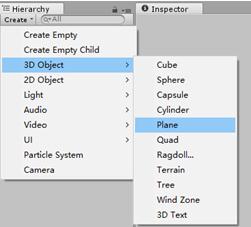 創建工程,然后在Inspector面板中創建物體Plane作為地面。