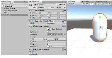 然后繼續在Inspector面板中創建子物體Capsule模擬人物模型,并調節Capsule物體的高度,使其底部處于Plane物體上。
