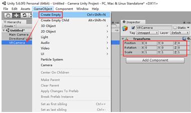 首先創建一個空物體并命名為VRCamera,用來作為兩個攝像機的父物體,并將VRCamera物體的Transform組件初始化。方便對VR攝像機的操作。
