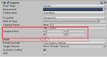 將Main Camera攝像機Transform歸0。將其拖到VRCamera下作為其子物體。并將Depth設置為-1。