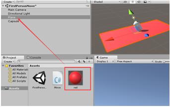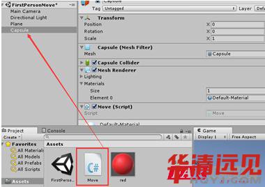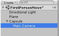 做到這一步驟,Capsule已經可以移動旋轉了。接下來做第一人稱的實現,將Inspector面板中的Main Camera,然后修改其位置和Capsule位置一致,并將Main Camera拖動為Capsule的子物體。