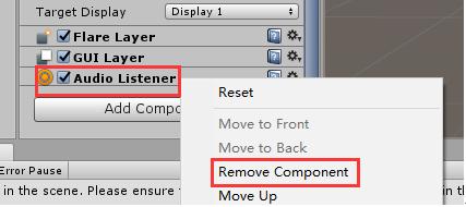 然后將其中任意一個Camera上的Audio Listener組件單擊右鍵選擇Remove Component移除掉(只移除一個)。