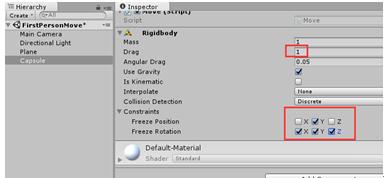 然后在Capsule物體上添加Rigidbody組件,并調整參數。