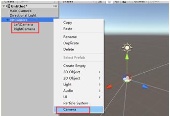 然后選中VRCamera物體,然后創建出兩個攝像機,分別命名為LeftCamera和RightCamera。作為VRCamera的子物體。