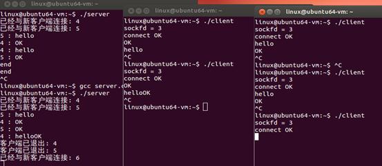 然后,gcc編譯服務器端和客戶端,分別生成可執行文件,在不同終端執行(左邊第一個為服務器端,之后的是客戶端),執行后結果如圖5所示: