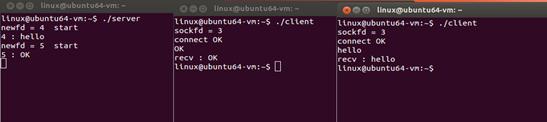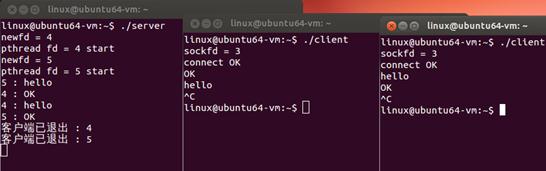 用一個終端執行服務器,多個終端執行客戶端,結果如圖4。左邊第一個是服務器端,先開啟;右邊2個是客戶端,同時訪問服務器;服務器為客戶端創建線程,同時處理這些客戶端。
