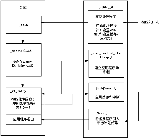 一般情況下,系統初始化代碼和主應用程序是分開的。系統初始化要在主應用程序啟動前完成。但部分與硬件相關的系統初始化過程,如啟用Cache和中斷,必須在C庫初始化代碼執行完成后才能執行。