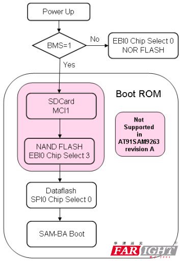 四.AT91SAM9261的啟動策略分析 系統上電復位后,首先會檢測BMS(Boot Mode Select)引腳上的電平,如果BMS檢測到1,系統從片上ROM啟動;如果檢測到BMS為0,系統從外部總線接口(EBI)片選0所接的存儲器(通常都是Nor Flash)啟動。 這一過程可用下圖表示: