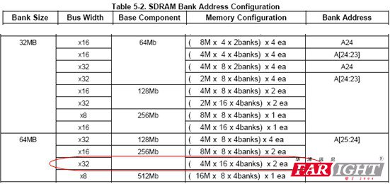 三、S3C2410和HY57V561620的接線方法 1、確定BA0、BA1的接線 在S3C2410的Table 5-2. SDRAM Bank Address Configuration給出了SDRAM接線的參考方法。