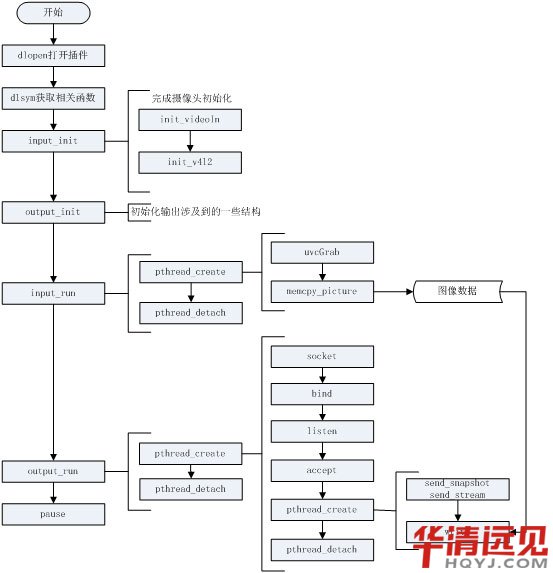 struct vdIn { 接著是把這個結構體寫入驅動中,用來初始化攝像頭。這個操作通過ioctl完成,涉及到的命令包括VIDIOC_QUERYCAP、VIDIOC_S_FMT、VIDIOC_S_PARM、VIDIOC_REQBUFS,VIDIOC_QUERYBUF,并通過mmap完成內存的映射。 后我們通過ioct命令完成圖片的讀取,涉及到的命令包括VIDIOC_QBUF和VIDIOC_DQBUF。然后把獲得的數據寫入到文件里就是圖片,通過網絡傳輸出去連續的圖片就是視頻。 二、 socket編程 在這個程序里使用的是tcp套接字,每有一個連接請求就創建一個線程單獨和這個請求通信,這里涉及到的函數包括socket、bind、listen、accept和write。 三、 多線程編程 為了能同時響應多個客戶端的請求,這里使用了多線程編程,為每一個請求建立一個連接,每個連接就是一個線程。這里涉及到的函數包括pthread_create、pthread_detach、pthread_cond_init、pthread_cond_destroy、pthread_mutex_init、pthread_mutex_destroy。 四、 mjpg-streamer工作流程