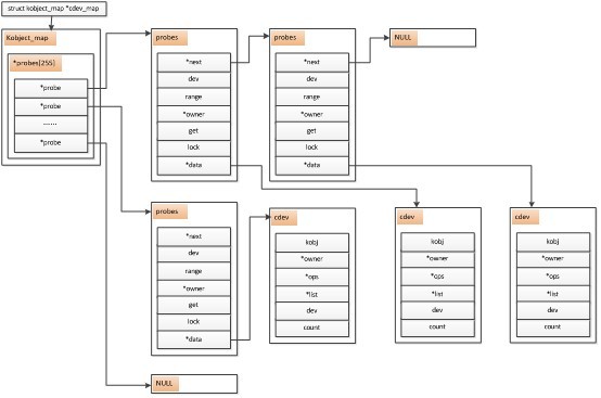 cdev_add實現cdev的注冊,linux內核里維護了一個cdev_map的表,所謂cdev的注冊就是把我們的cdev注冊到cdev_map表上,cdev_map表結構如圖: