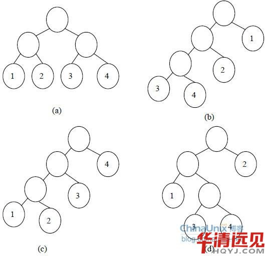 哈夫曼樹是二叉樹的一個典型應用,利用哈夫曼樹,我們可以形成哈夫曼編碼,進而實現對數據的壓縮與解壓處理。 哈夫曼樹(Huffman Tree),又叫優二叉樹,指的是對于一組具有確定權值的葉子結點的具有小帶權路徑長度的二叉樹。 當中的幾個概念我們不得不說一下: (1)路勁(Path):從樹中的一個結點到另一個結點之間的分支構成兩個結點間的路徑。 (2)路徑長度(Path Length):路徑上的分支樹。 (3)樹的路徑長度(Path Length of Tree):從樹的根結點到每個結點的路徑長度之和。在結點數目相同的二叉樹中,完全二叉樹的路徑長度短。 (4)結點的權(Weight of Node):在一些應用中,賦予樹中結點的一個有實際意義的樹。 (5)結點的帶權路徑長度(Weight Path Length of Node):從該結點到樹的根結點的路徑長度與該結點的權的乘積。 (6)樹的帶權路徑長度(WPL):樹中所有葉子結點的帶權路徑長度之和 在下圖所示的四棵二叉樹,都有4個葉子結點,其權值分別1、2、3、4,他們的帶權路徑長度分別為: (a)WPL = 1 x 2 + 2 x 2 + 3 x 2 + 4 X 2 = 20 (b)WPL = 1 x 1 + 2 x 2 + 3 x 3 + 4 x 3 = 28 (c)WPL = 1 x 3 + 2 x 3 + 3 x 2 + 4 x 1 = 19 (d)WPL = 2 x 1 + 1 x 2 + 3 x 3 + 4 x 3 = 29