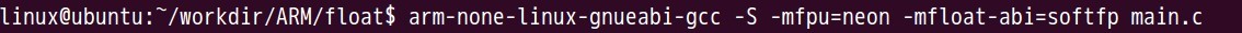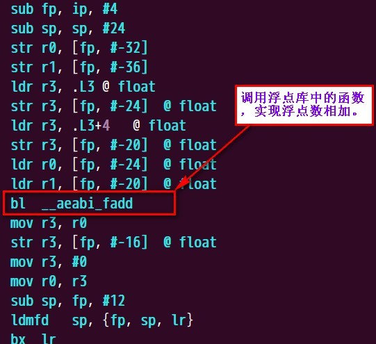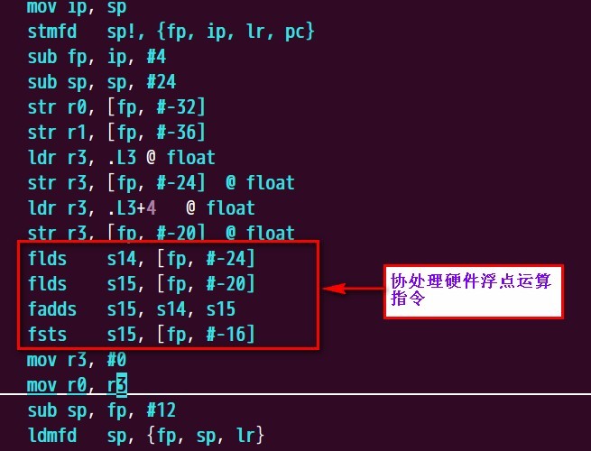 從圖中我們可以知道,默認情況下,編譯器使用的是軟浮點,圖中__aeabi_fadd這個函數是在浮點庫中實現。如果想讓代碼能正常的運行,還需要在連接的時候靜態連接一下浮點庫。 在這里我們以一個完成的案例來說明一下,軟浮點庫的使用方法。 start.S: 使用硬件浮點實現浮點運算(hard-float) 使用硬件浮點的時候,我們需要給編譯器傳遞一些參數,讓編譯器編譯出硬件浮點單元處理器能識別的指令。 (1)-mfpu=name 參數-mfpu就是用來指定要產生那種硬件浮點運算指令,常用的右vfp和neon等。 浮點協處理器指令: ARM10 and ARM9: (2) -mfloat-abi=value -mfloat-abi=soft 使用這個參數時,其將調用軟浮點庫(softfloat lib)來支持對浮點的運算,GCC編譯器已經有這個庫了,一般在libgcc里面。這時根本不會使用任何浮點指令,而是采用常用的指令來模擬浮點運算。但使用的ARM芯片不支持硬浮點時,可以考慮使用這個參數。在使用這個參數時,連接時一般會出現下面的提示: undefined reference to `__aeabi_fdiv' 或者類似的提示,主要因為一般情況下連接器沒有去主動尋找軟浮點庫,這時使用將libgcc庫加入即可。 -mfloat-abi=softfp -mfloat-abi=hard 這兩個參數都用來產生硬浮點指令,至于產生哪里類型的硬浮點指令,需要由 -mfpu=xxx參數來指令。這兩個參數不同的地方是: -mfloat-abi=softfp生成的代碼采用兼容軟浮點調用接口(即使用-mfloat-abi=soft時的調用接口),這樣帶來的好處是:兼容性和靈活性。庫可以采用-mfloat-abi=soft編譯,而關鍵的應用程序可以采用-mfloat-abi=softfp來編譯。特別是在庫由第三方發布的情況下。 -mfloat-abi=hard生成的代碼采用硬浮點(FPU)調用接口。這樣要求所有庫和應用程序必須采用這同一個參數來編譯,否則連接時會出現接口不兼容錯誤。 我們對main.c文件使用硬件浮點重新編譯: