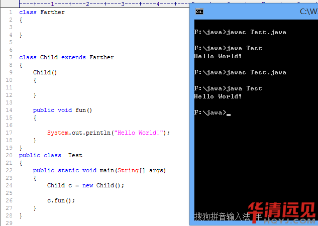 這個(gè)例子非常簡單,有一個(gè)子類Child繼承于父類Father,然后在測試類Test中使用子類引用。調(diào)用子類中的fun方法,執(zhí)行結(jié)果和我們預(yù)料的一樣: