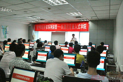 為了提升學員的職業素質,讓同學們能夠更深入的了解嵌入式開發的方向和前景,找準自己的工作方向、抓住就業和發展機會,獲得心儀的工作。2011年8月22日下午13:30,華清遠見就業部特邀嵌入式資深專家何小慶老師,為即將畢業的1106班學員們特別安排了一場“工程師職業規劃”專題講座,講座內容深深的吸引了在座的全體同學。