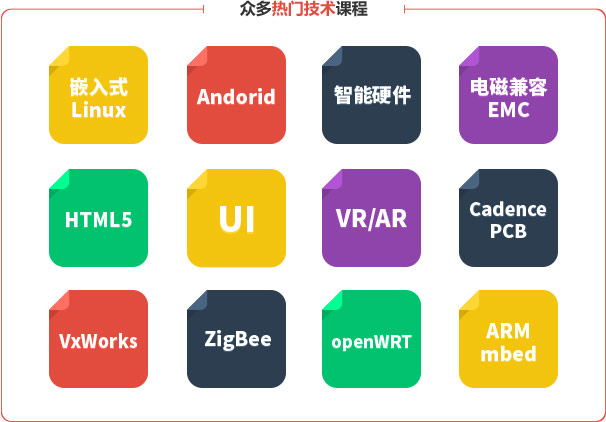 集團緊跟科技發展潮流,專注于高端IT開發人才的培養。目前線下培訓課程涵蓋嵌入式開發、物聯網開發、移動互聯網開發(Android、iOS、HTML5、UI、VR/AR)三大方向。從長期就業培訓到短期高端企業內訓,以及高校師資隊伍培訓,課程涵蓋技術方向廣泛,能夠滿足不同人群的學習工作需求。集團擁有一支超過百人的師資團隊,不乏專家及資深技術開發人員。每年在課程研發、課程更新方面投入巨大的人力物力,目前公開出版教材90余本。在技術實力以及實驗設備配置方面均處于業內地位。