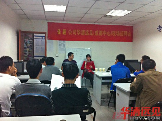 公司對本次專場招聘很重視,公司翟總于10月10日親自到華清遠見成都中心考察參觀,與成都中心的學術經理潘老師深入的交談,敲定招聘人員的要求。10月23日專門召開公司招聘工作準備會議。10月24日由公司郭副總帶隊一行三人到成都中心舉辦專場招聘會。